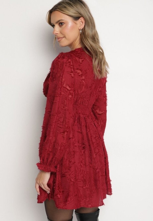 Bordowa Rozkloszowana Sukienka Koronkowa z Gumką w Pasie Semittes